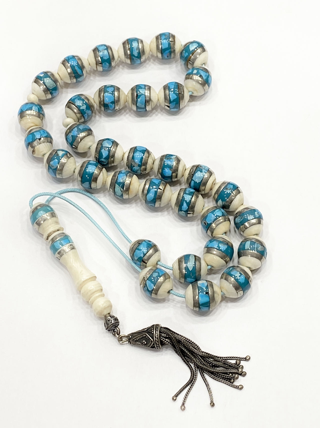 komboloi ivory 100% hand made 33 beads turquoise with silver 92 grams